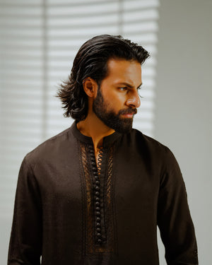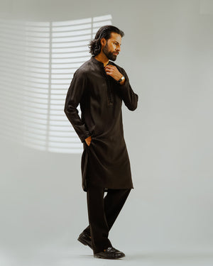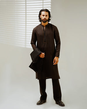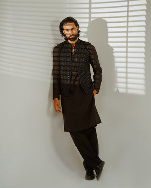A sleek and sophisticated ensemble featuring a black kurta with intricate tarkashi embellishments, paired with a heavily embroidered black waistcoat adorned with cut dana, and complemented by plain pants.