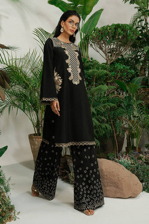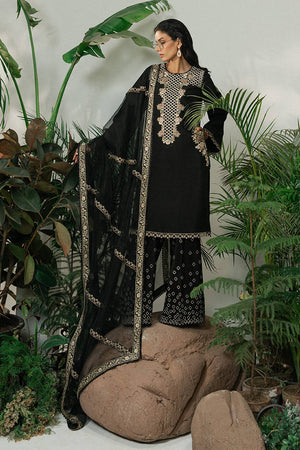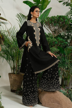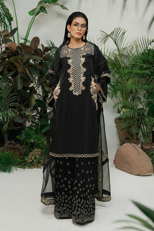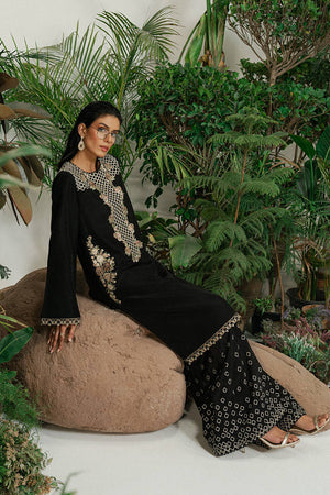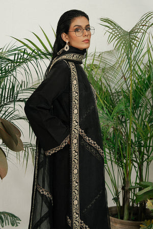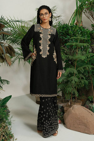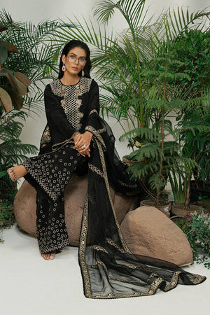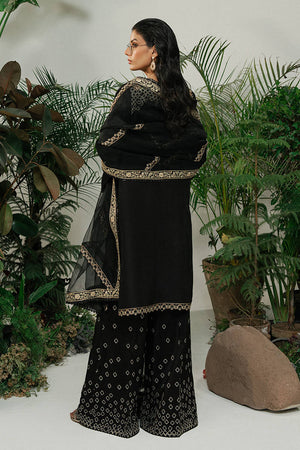A black ramen silk kameez with long, linear embroidery inspired by wicker patterns and floral borders in gold and soft metallic tones. The neckline, sleeves, and hem are finished with thin embroidered borders, keeping the look refined. Wide-leg ramen silk trousers feature gold embroidery in a cascading diamond pattern. A sheer black organza dupatta, edged with fine embroidery, adds movement. A sharp monochrome look with texture and depth.