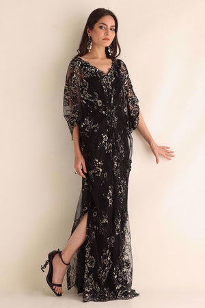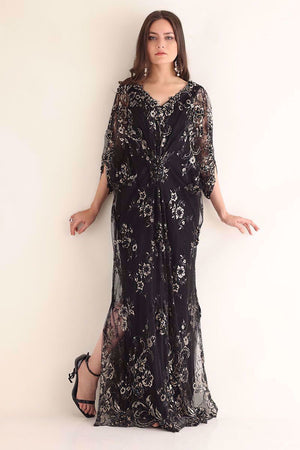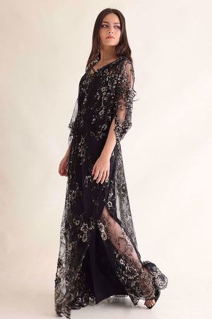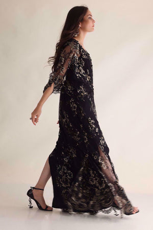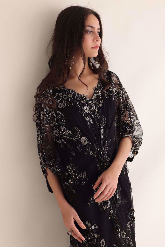 A perfect fusion of modern and traditional heritage. This black and gold Chantilly net kaftan is highlighted with hand-crafted motifs of crystals, sequins, pearls, diamantes, cut dana, and sequins on the neckline, daman, and sleeves.