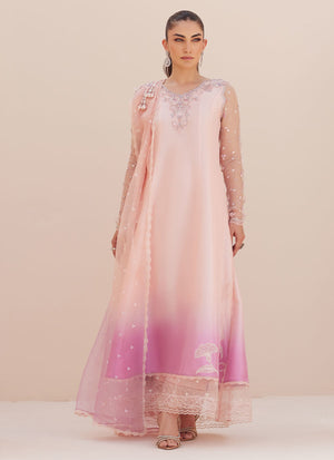Don’t miss out on the timeless elegance and unmatched versatility of our Deedee ensemble.A canvas of dreamy pale pink fluidly darkens into a darker hue is adorned with stunning composed embroidery in silver and pearls. Delicate florals bloom along the front and back necklines, while the sleekly fitted sleeves, cut from organza are dotted with sequins, as well as mini 3D flowers. Gorgeous hand worked florals adorn the side slits in the front. The accompanying ethereal organza dupatta with trimmed with scallop lave completes your ensemble. Eternally stylish, irresistible details will make this one of your smartest buys this season!