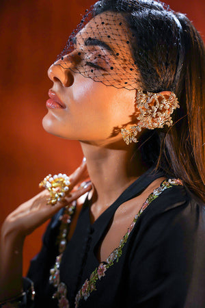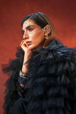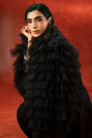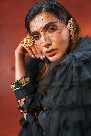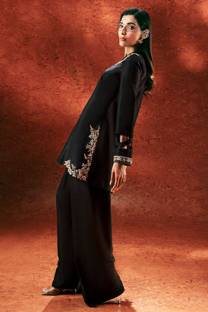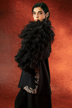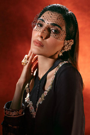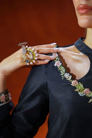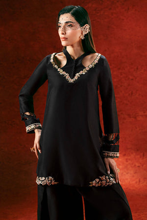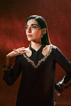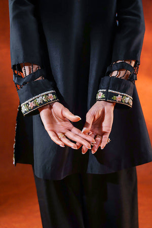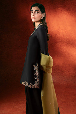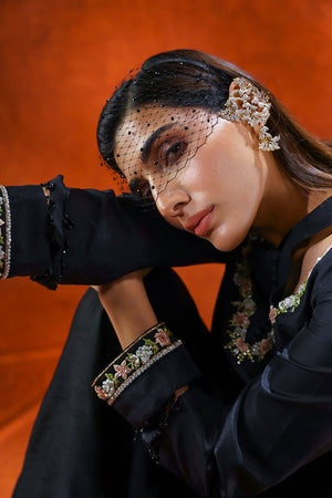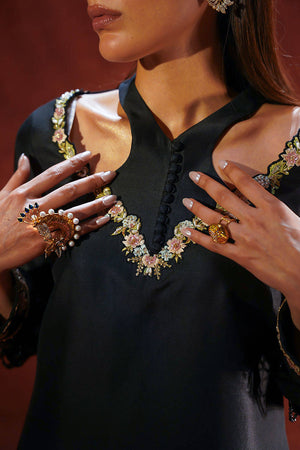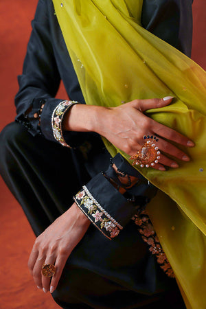 A classic black raw silk short shirt, adorned with delicate embroidery and intricate hand embellishments of Swarovski crystals and dabka along the neckline and sides, exudes timeless elegance. The sleeves are further elevated with stunning bead detailing, adding a touch of sophistication to the design. To amplify the drama, the outfit is paired with an exaggerated black shalwar, perfectly complementing the ensemble. A contrasting olive green and black organza dupatta, featuring meticulously hand-placed embellishments and exquisite detailing, completes this refined and captivating look.