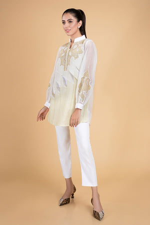 A modern take on the basic kurta adding more sophisticated look by using sheer voil fabric perfect for the summer day with added cutout detail on the front. The mixture of a light pistachio green and white over the front and back with paisley applique button down neckline and bishop sleeves.Ensemble: 1 PC