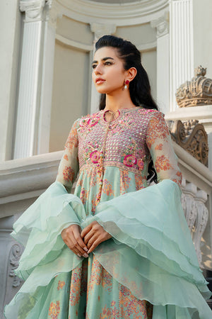 A sea foam Green peshwas with heavy embellished bodice and key-hole neck-line embroidered hem borders and fitted sleeves. Completed with ruffle dupatta, paired with plain raw silk churidar.