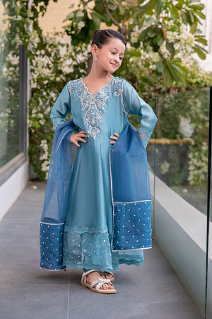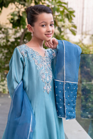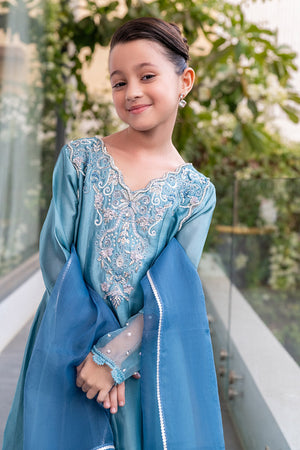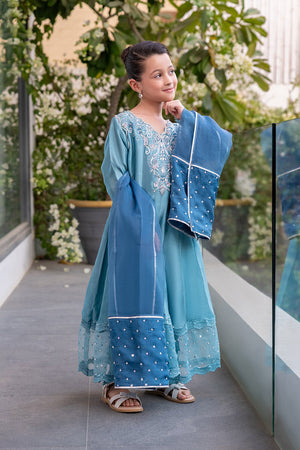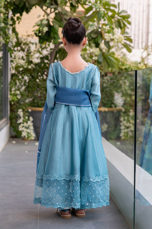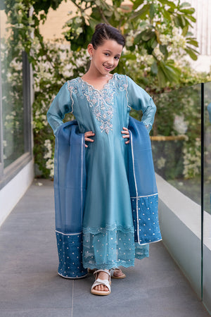 This stunning Denim Blue Kalidar frock is designed in luxurious pure sheesha silk, featuring delicate organza borders that enhance its ethereal look. The long frock is paired with straight pants, offering a sleek and sophisticated silhouette. The ensemble is completed with a contrasting blue embellished organza dupatta, adding a perfect touch of elegance. The neckline of the dress is intricately adorned with a beautiful combination of kora, pearls, French knots, crystals, and stones, creating a captivating focal point. This dress is an ideal choice for those seeking a perfect blend of traditional elegance and modern style, making it perfect for weddings, festive events, or any special occasion.