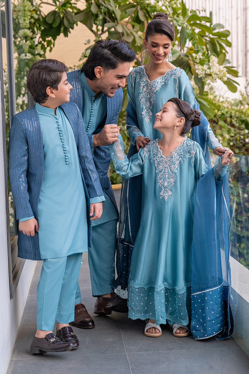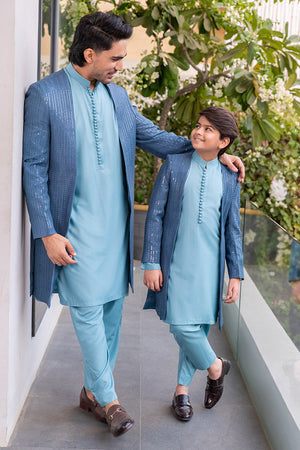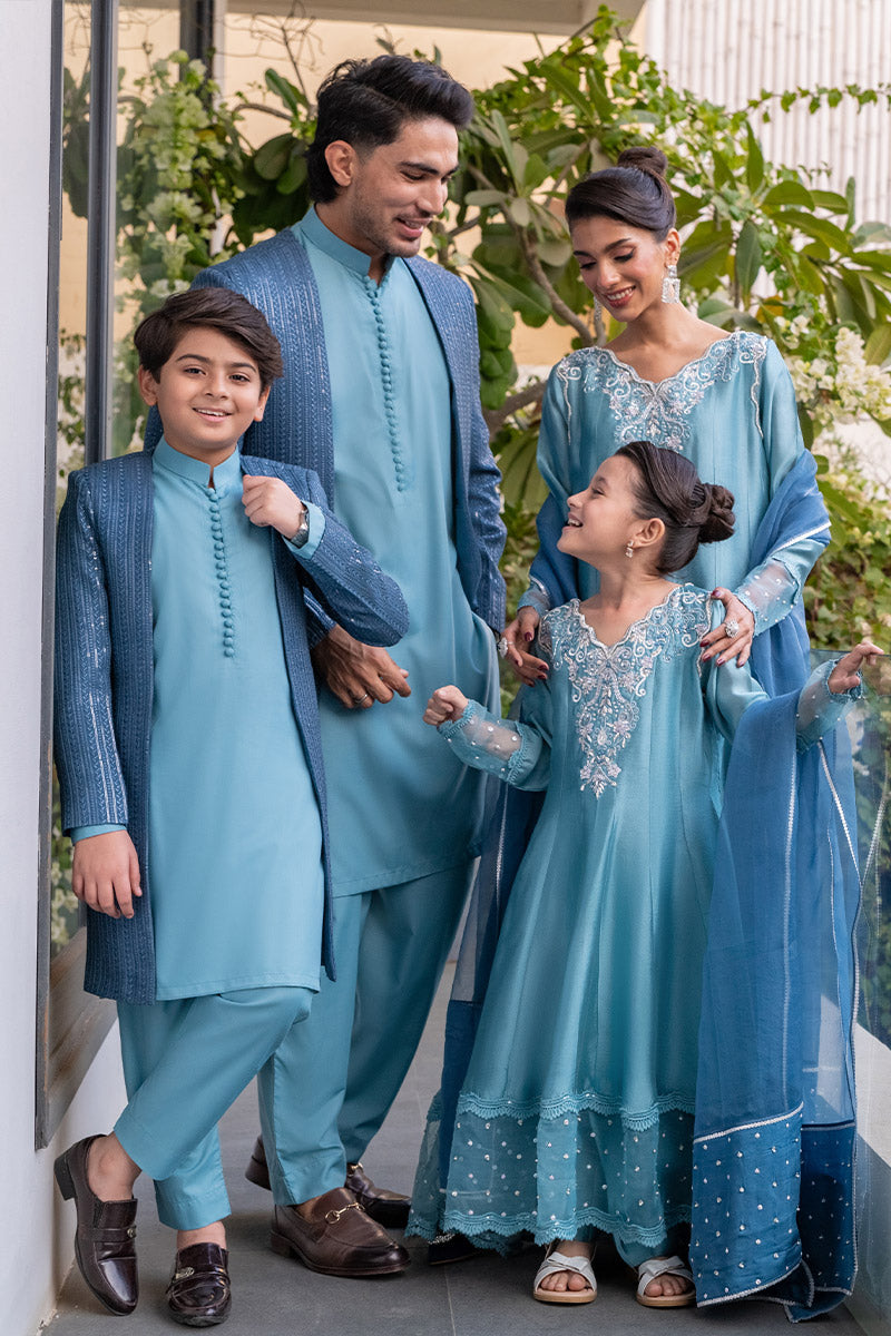 Presenting a sophisticated ensemble featuring a prince coat crafted from embroidered raw silk, complemented by a wrinkle-free polycotton shirt and matching pants. This outfit seamlessly blends elegance and comfort, making it perfect for special occasions. The exquisite embroidery on the coat adds a luxurious touch, while the polycotton fabric ensures a neat and stylish appearance.
