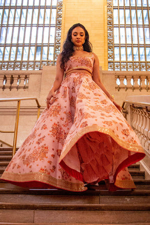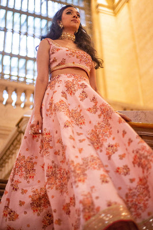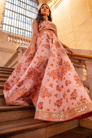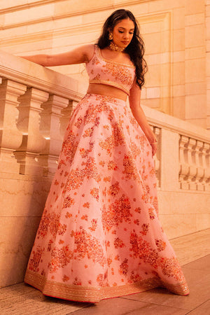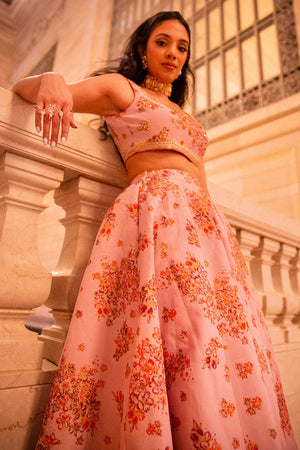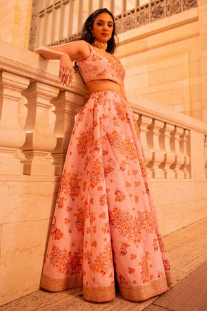 An eye catching printed rose pink lehnga finished with embroidered borders paired with hand embellished printed choli.