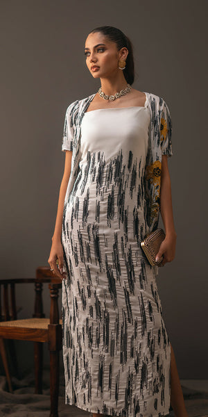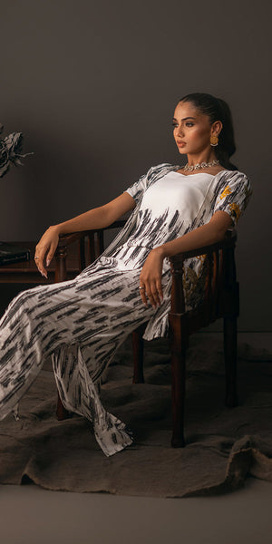 This striking ensemble features a sarong with spaghetti straps, designed in a delicate georgette fabric. The sarong’s standout detail is its unusual sequence pattern of lines, which adds a contemporary and sophisticated edge to the classic silhouette. Paired with this is a matching jacket, which echoes the sarong’s distinctive pattern and introduces a subtle hint of mustard in the floral accents, bringing a touch of warmth and vibrancy to the overall look. The jacket’s short sleeves provide a modern, airy feel, perfectly complementing the sarong’s fluidity. Together, these pieces create a cohesive and stylish outfit that exudes both elegance and individuality.