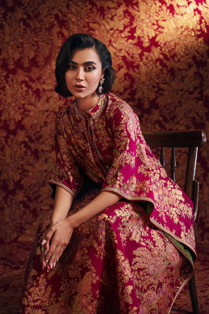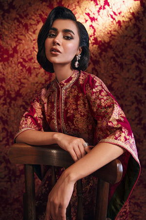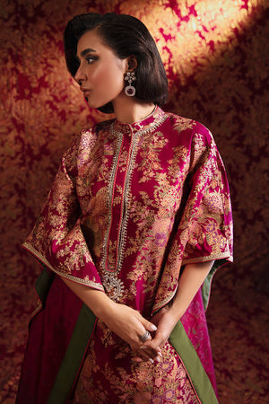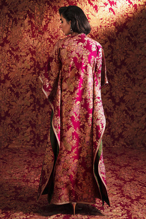 An eye catching screen printed magenta kaftan with hand embellished neckline, paired with green plain raw silk pants. Kaftan Length: 52 Model Height: 5'2