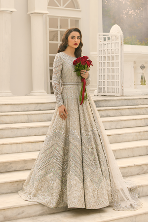 Get ready to be spellbound by the ethereal beauty of this pearl white maxi dress on net fabric. This statement piece with zardozi and sequin work on adda adorned with cut dana and crystal beads, filled with exquisite adda work of sequin flowers that shimmer and shine with every movement. The veil is adding dream-worthy ode to aura to accentuate the bridal look. This couture masterpiece is a true testament to the fusion of elegance and craftsmanship.