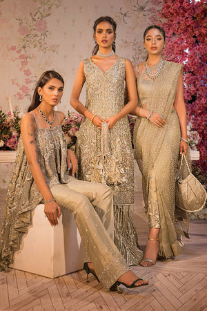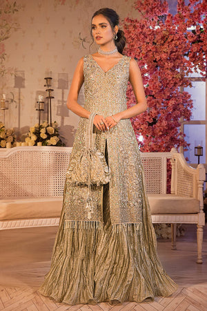 Chic and filled with feminine elegance, this choli on pure raw silk is embellished with beaded and sequined florals in powder pink and hues of mint. Paired with elegant floral patterned digital lehanga and borders with hand touched details with hints of mirror work and sprayed sequins. Completes the look with contrasted powder pink dupatta on organza with embellished florals and scalloped edges. Striked with an add on of floral digital printed potli bag with hand work details.