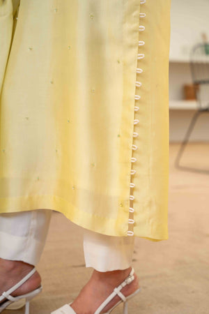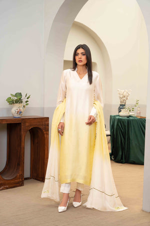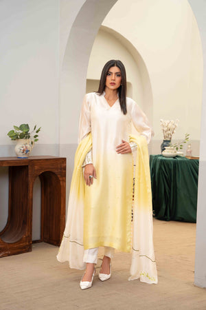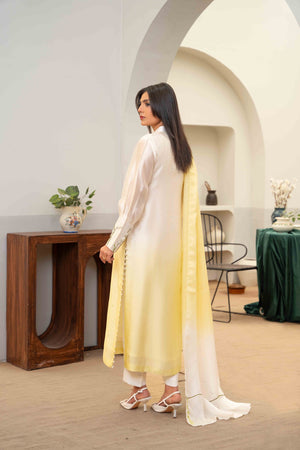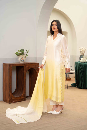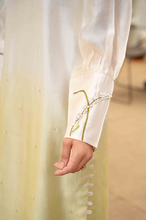 A beautiful ombre mirror silk with a sharp silhouette in curated with swarovski, pearls and hand embroidery on the cuff of sleeves enhance the beauty of outfit. Spray of sequence add a charming look on front of hem with ombre embroidered dupatta paired with cigarette trousers.