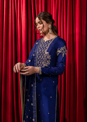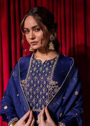 This elegant navy blue long shirt includes an embellished neckline as well as details on the sleeves. Encrusted with dull gold dabka, naqshi, sitara hand embellishment work. It also includes a 3 yards dupatta with embroidery and sequins boti all over, made for the perfect festive-wear season."