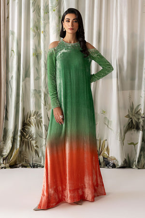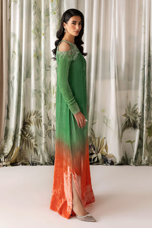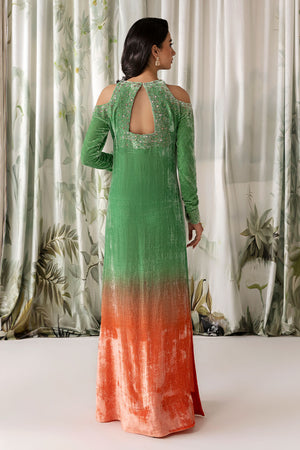 Green and orange kaftan dress a perfect bled of modern fusion in ombre effect from sea green to orange give very refreshing look. A shoulder cut gives a very trendy look with handwork around front, back neck and shoulders.