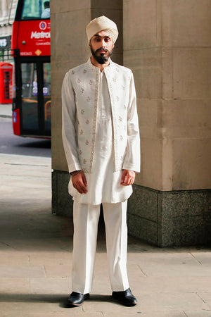 Introducing Diljit — a sophisticated white vest crafted from cotton net, adorned with block-printed floral boteh motifs and accentuated by delicate aari work. Layered over a plain cotton net kurta featuring tonal details around the button placket, and paired with matching plain trousers, this ensemble offers classic lines, with a contemporary cool look