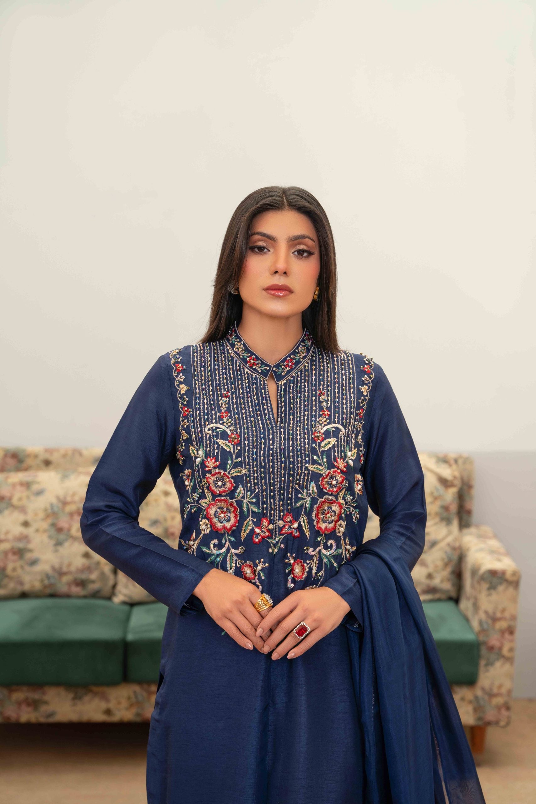 Dixie features a navy blue silhouette with multi colored 3d floral embroidery on the neckline adding a vibrant contrast, creating an eye catching effect. Paired with dupatta and flared trousers.