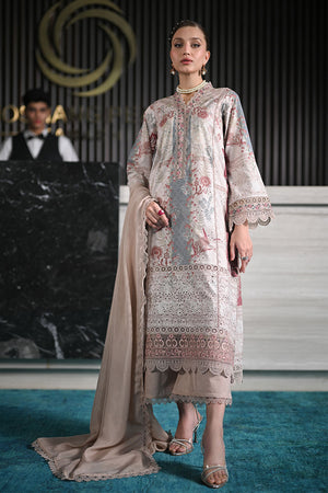 A stunning printed long shirt in a timeless beige and brown palette, elevated with embroidered organza lace borders and intricate lace detailing. The graceful bell sleeves add a touch of drama, while the ensemble is completed with a beautifully tailored izaar and a luxurious silk dupatta.