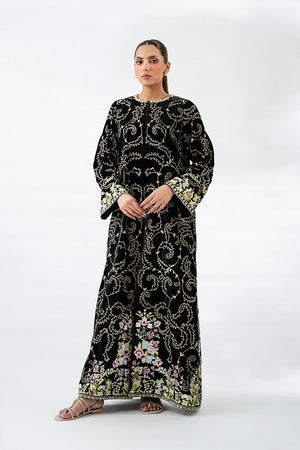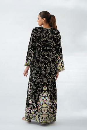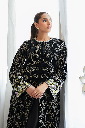 A vision of timeless sophistication, this velvet jacket is adorned with intricate gold thread embroidery in swirling paisley and vine motifs, creating a rich sense of depth and texture. Gemstone-encrusted, necklace-like embellishment adds a touch of radiance, while delicate resham florals in soft lilac, blush, and ivory bloom along the hem and sleeves, infusing subtle color into the plush canvas.