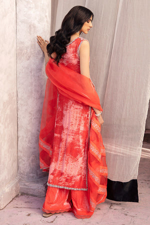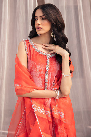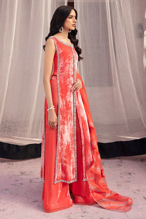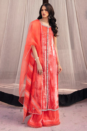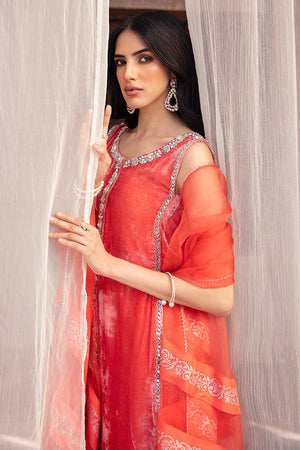 This shirt, crafted from Pure Silk Velvet in a peach color, features elegant embroidery on the luxurious fabric. Pair it with the block-printed dupatta and the included pants to create a sophisticated and coordinated look suitable for a variety of occasions.