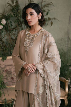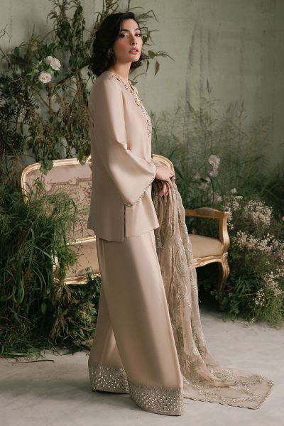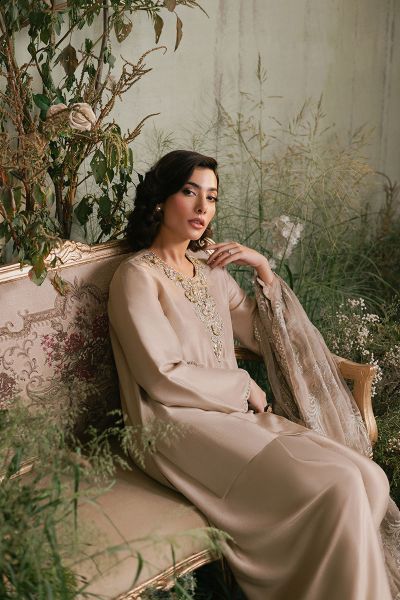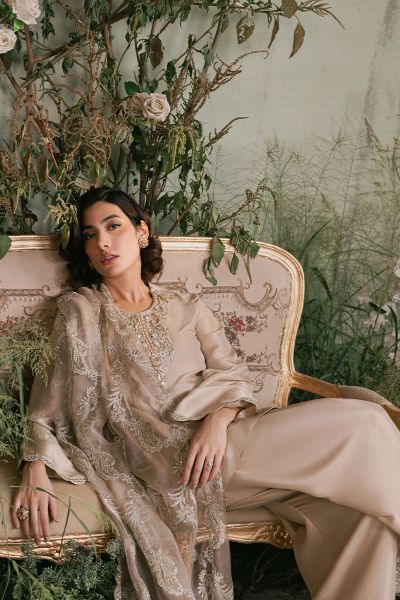 This ensemble features a chic beige raw silk short shirt that exudes elegance and sophistication. The shirt is paired with a classic shalwar, creating a timeless silhouette. Complementing the outfit is a stunning fully embroidered organza dupatta, intricately adorned with delicate embroidery that adds a touch of opulence and grace. The combination of raw silk, organza, and detailed craftsmanship makes this outfit perfect for formal occasions, blending traditional style with a modern aesthetic.