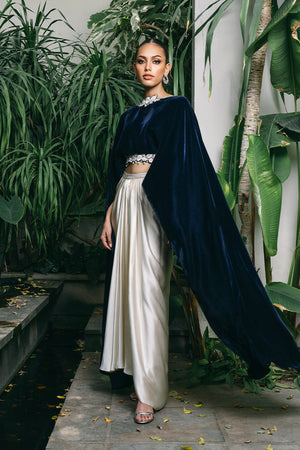 A high fashion spin to sway from your regular festive wear, the stark contrast in hues catches the eye. A pre draped ivory skirt cut from charmeuse is paired with a high-low midnight blue velvet crop top with dramatically long cape sleeves cascading down regally. The statement neckline and hem of the top is rendered with floral cutouts embroidered with resham and pearls.
