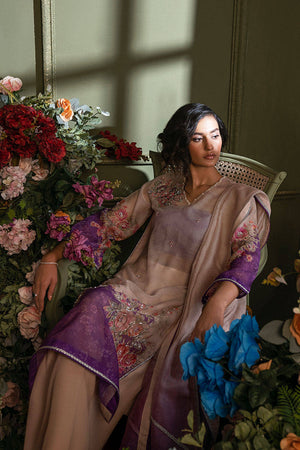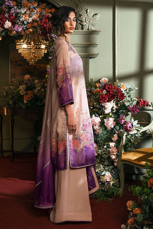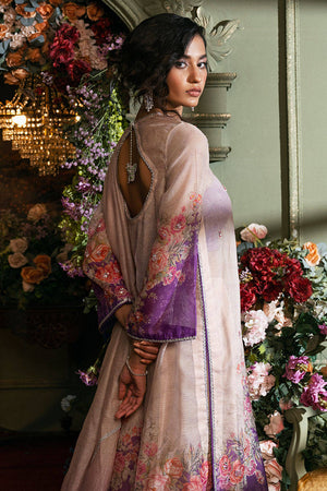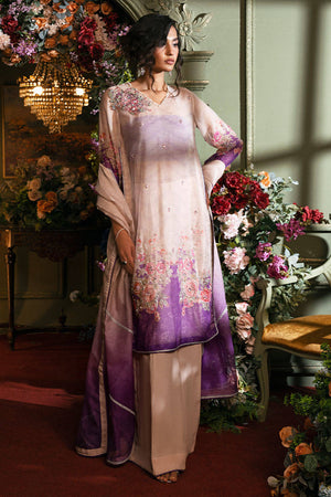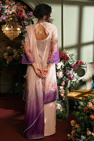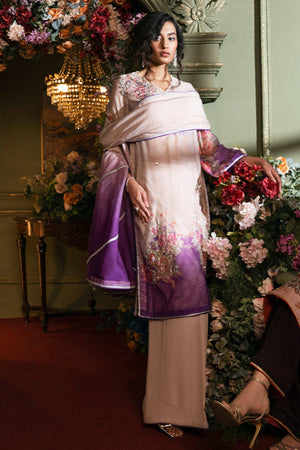 A stunning khaddi net printed long shirt with embellished motif on neckline and embellishments all over the shirt, and a beautiful key hole back with an embellished butterfly. Paired with a two toned khaddi net dupatta and lavender slip