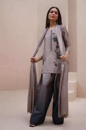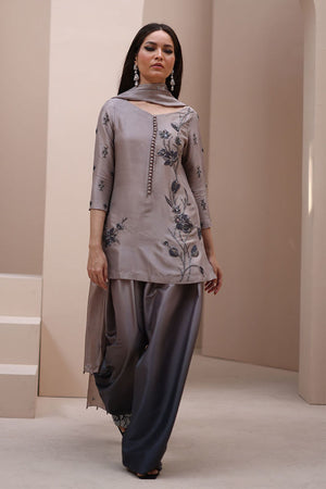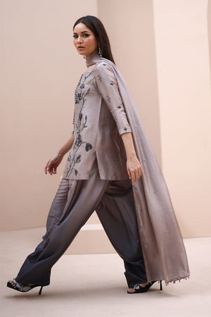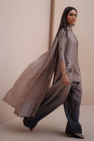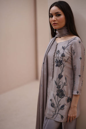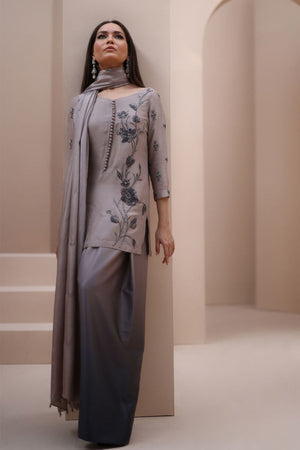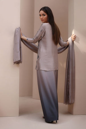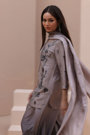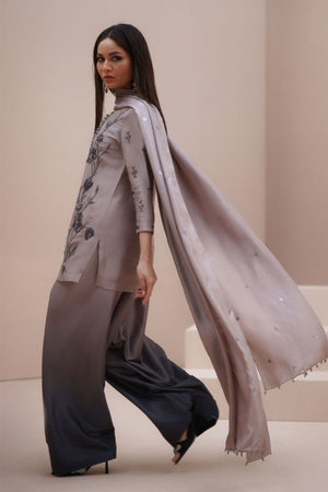 Exquisite Moon Rock Silk Ensemble – Crafted from Pure Raw Silk, Ombre Silk, and Medium Silk, this luxurious outfit features intricate embroidery, 3D Resham work, handwork with Mate Moti, Crystals, Tikki Stones, Cutdana, and shimmering sequins. The dupatta is adorned with all-over boti, delicate chan, and crystal hangings on the pallu, making it a perfect blend of elegance and craftsmanship.