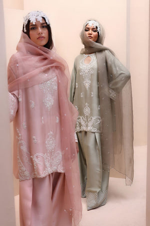 Timeless Elegance in Desert Sage – This luxurious ensemble is crafted from Pure Raw Silk for the Shirt and Shalwar, complemented by a delicate Pure Organza Dupatta. Adorned with intricate all-over Ivory Resham and Lorix embroidery, it features exquisite handwork detailing with Moti, Crystals, Tikki Stones, Sequins, Cutdana, and Pearls. The ensemble is further enhanced with a sequins handwork border, while the dupatta showcases all-over sequins chan with crystal hangings on the pallu, exuding sophistication and charm.