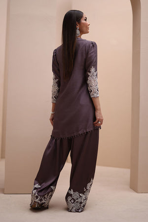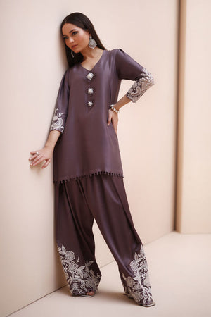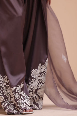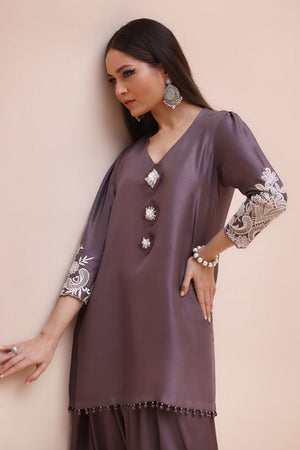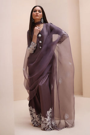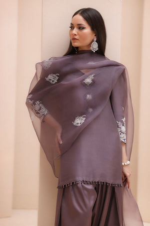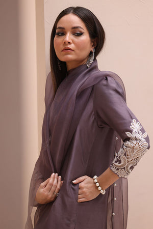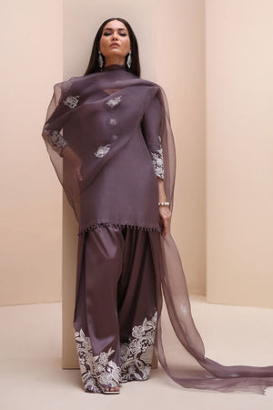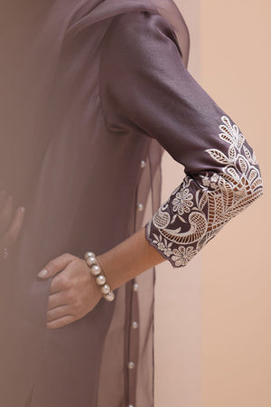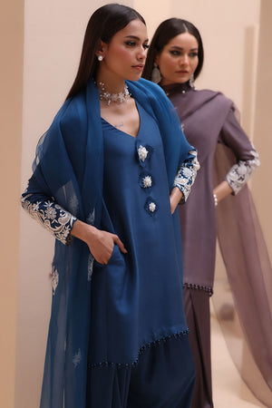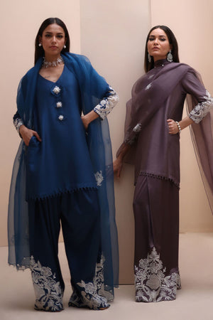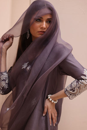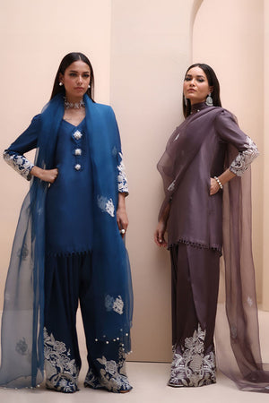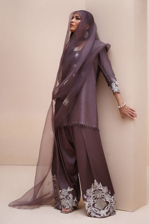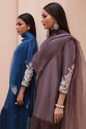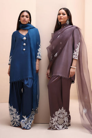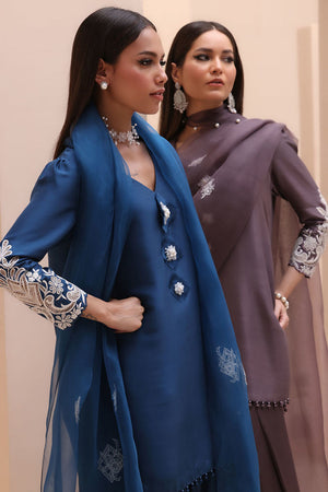 Refined Sophistication in Sparrow – This elegant ensemble features a Pure Raw Silk Shirt, Shine Silk Shalwar, and a delicate Pure Organza Dupatta. The shirt is adorned with exquisite Ivory Resham Tarkashi embroidery on the sleeves, complemented by handcrafted bunches on the neckline and handmade hangings on the daman. The shalwar showcases intricate Ivory Resham Tarkashi embroidery on the bottom, while the dupatta is gracefully finished with handcrafted tassels on the pallu, adding a touch of timeless artistry and sophistication.