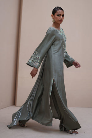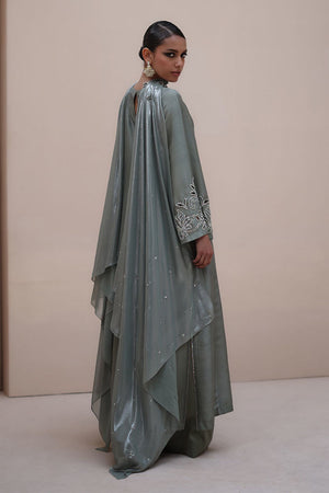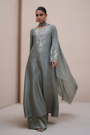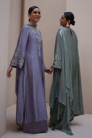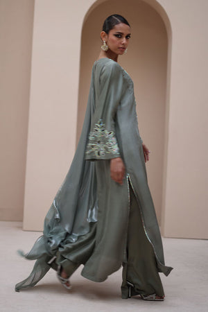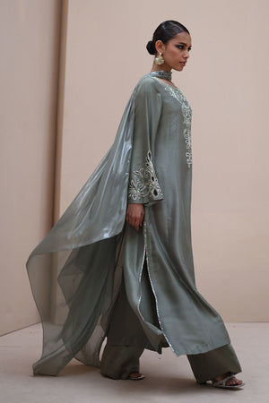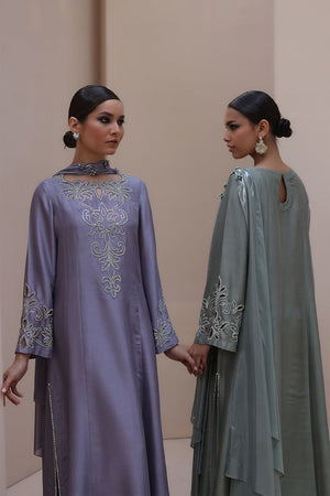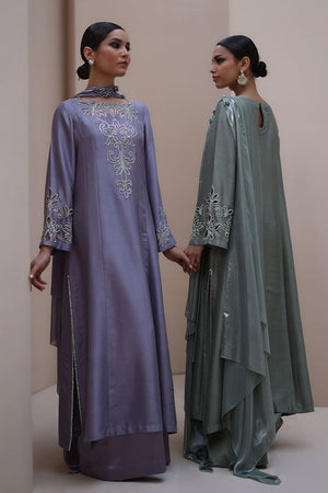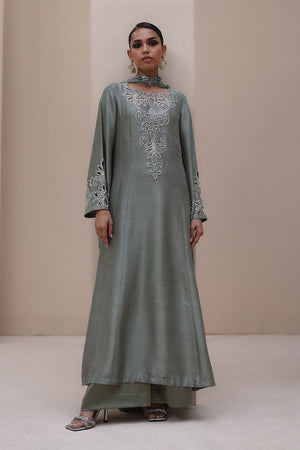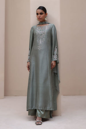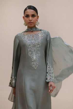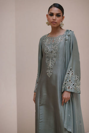 Serene Elegance in Iceberg Green – This exquisite ensemble features a Pure Raw Silk Shirt, Shine Crepe Silk Culottes, and a delicate Lame Chiffon Dupatta. Adorned with intricate hand-stitched stonework on the neckline, sleeves, and side slits, it exudes a refined and graceful charm. The ensemble is further enhanced with delicate handwork boti and chan embellishments, adding a subtle shimmer for an effortlessly sophisticated look.