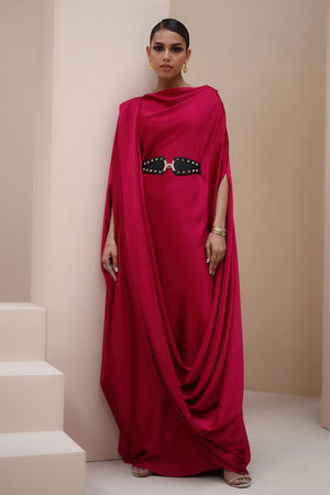Bold Sophistication in Persian Red – This stunning kaftan, crafted from luxurious Textured Silk, is designed to make a statement. It is elegantly cinched at the waist with a chic belt, creating a graceful silhouette that blends effortless glamour with timeless charm.