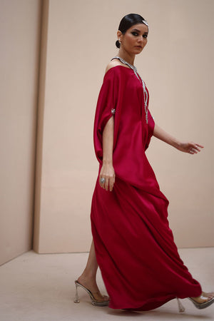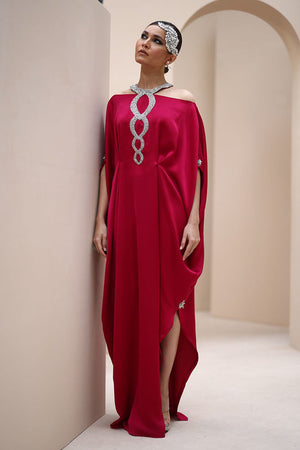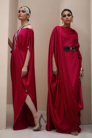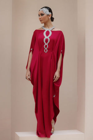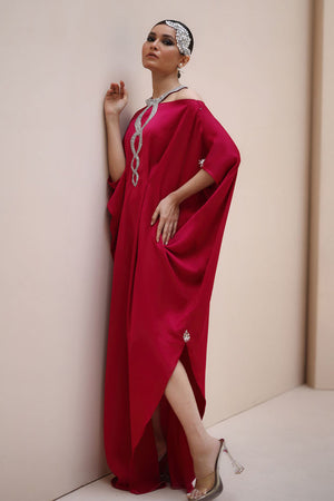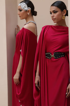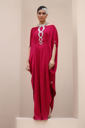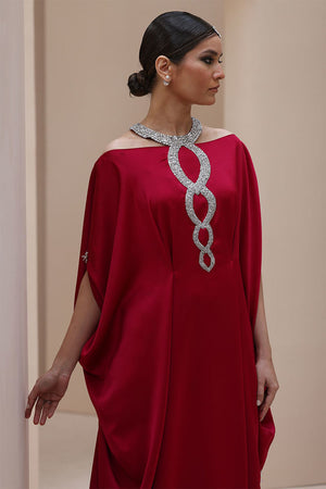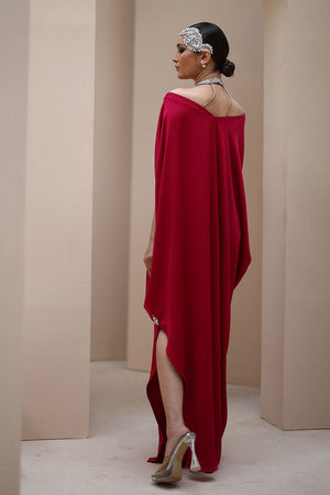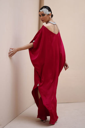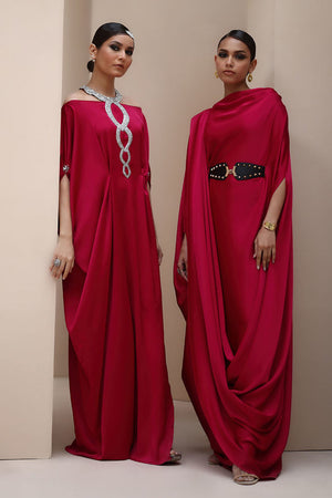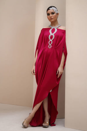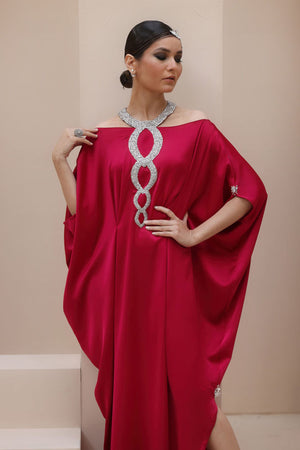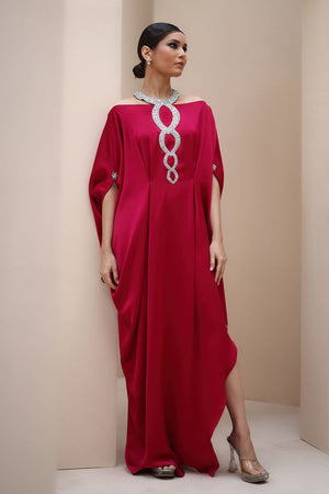 Regal Elegance in Persian Red – Crafted from luxurious Textured Silk, this exquisite ensemble is adorned with hand-stitched stonework on the neckline and delicate boti embellishments on the sleeves. A perfect fusion of timeless sophistication and intricate craftsmanship.