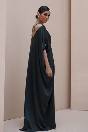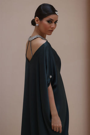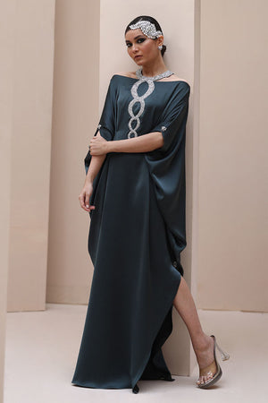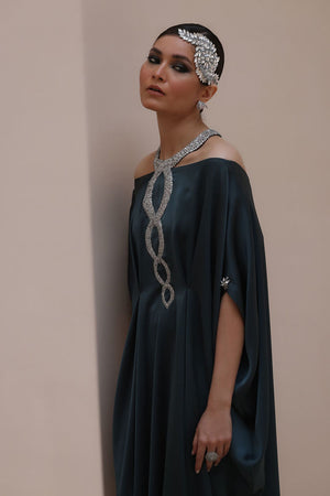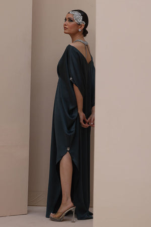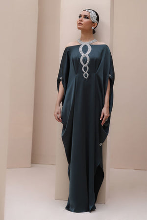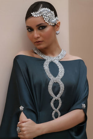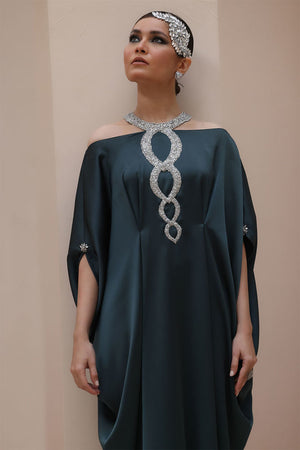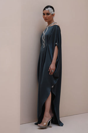 Striking Elegance in Poison Green – Crafted from luxurious Textured Silk, this embellished kaftan features intricate hand-stitched stonework on the neckline and delicate boti detailing on the sleeves. A perfect fusion of bold sophistication and timeless charm.