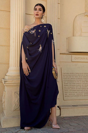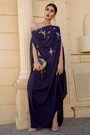 Navy blue ensemble timeless off-shoulder Kaftan in double georgette embellished with jeweled that includes 3D jeweled flowers, stones, feather finishing's, metallic chains, cut dana and pearl hangings. Same color Pants can be bought to complete the look.