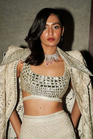 Prepare to be enthralled by the resplendent allure of 'Éblouissant,' an opulent ensemble that transcends mere fashion. Enveloped in a breathtaking symphony of Swarovski crystals and intricate embroidery, this creation is a testament to unparalleled craftsmanship. The audacious backless blouse exudes bold sophistication, while the mesmerizing skirt, adorned with artful embellishments, captivates the senses with its intricate details. The pièce de résistance is a quintessential Zain Hashmi jacket, resplendently constructed from shimmering crystals. This is not just an outfit; it is a statement of unforgettable grandeur and timeless elegance, destined to leave an indelible impression.