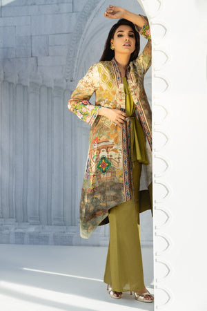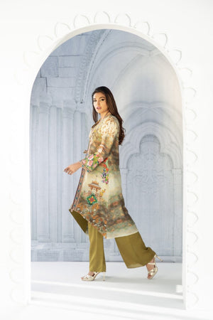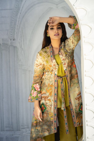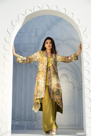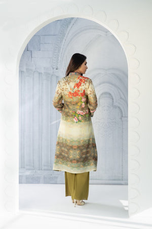 Digital printed cotton silk canvas inspired by French era, with hint of olive green and pop up colours. Applique work enhanced the over all look of the outfit. The overcoat comes with slip and can be paired with pants as shown in the picture. Best for summer wear, collage wear, brunches and hi-teas.