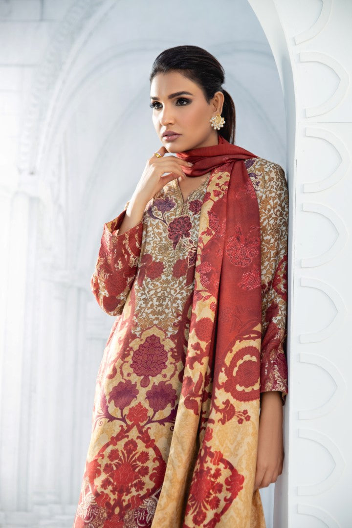 Classic straight shirt silhouette print on cotton silk fabric this print is inspired by the Tudor era art textile depicting different shades of maroons and reds with the hint of coffee colour texture beautiful antique golden tila thread lace enhanced with golden sequin used as the galla pati floral print on the velvet appliqued on the galla and enhanced with resham and gold thread outline.Can be paired with stole and pants as shown in the picture. Best for summer wear, collage wear, brunches and hi-teas.