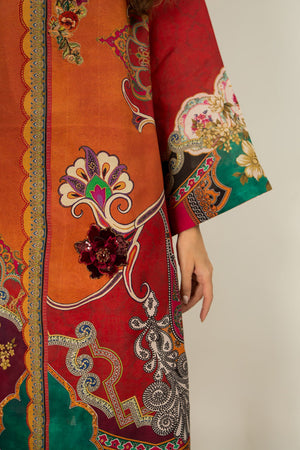 Long classic straight shirt print on the cotton silk fabric luxurious design is inspired by the floral and and geometric ornaments. Floral resham thread embroidery on the shirt beautiful handcrafted 3D flower appliqued on the shirt. Gives you a complete look when paired with same solid pants.