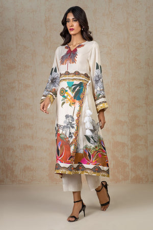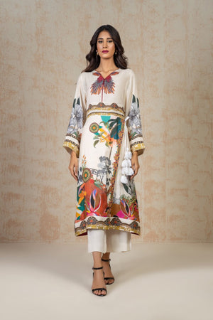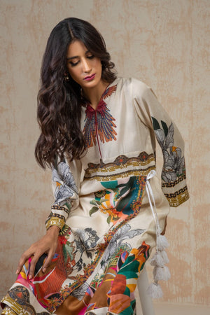 White hue, adorned with tropical-inspired art draped in cotton silk fabric and tassel detailing on the front. This outfit ensures the comfort through out the events. Paired with capri style trouser.