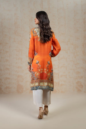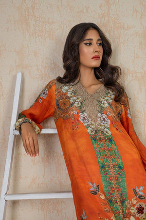 This enchanting attire in bright hues of orange creates modernity in your wardrobe. Sleeves have gathered hem in straight cut shirt. The front part is an applique floral motif.