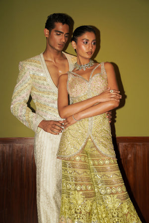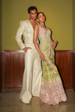 Prepare to turn heads with this captivating ensemble, 'Éclat'. The journey begins with a form-fitted top, boasting a flattering sweetheart neckline and shimmering crystal embellishments, its hue alternating between vibrant green and bold pink. This dynamic interplay extends to the wide-leg pants, where the colors dance in harmonious exchange, creating a unique and irresistible composition. Along the seams, intricate embroidery weaves its tale, while a playful scalloped hem adds a touch of whimsy. This bold fusion of colors and textures culminates in a look that's undeniably elegant and eye-catching, destined to leave a lasting impression wherever your path may lead.