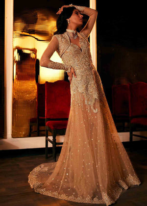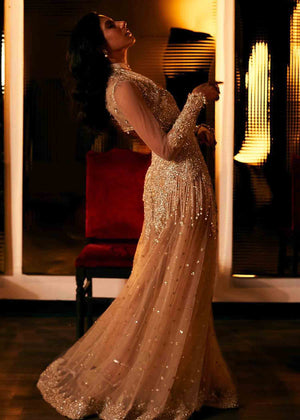 Description: Eclatant is a pristine work of art which is encrusted in hand-crafted Zardozi, fused with delicate Swarovski and sequin detailing. To evoke a charming mystique, the spider web champaign tulle gown is paired with an exquisitely embellished cropped bolero and embezzled brocade cigarette pants complete this fairy-tale look.