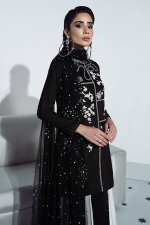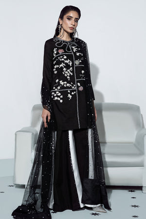 Presenting "Eclipse," a stunning black outfit made from opulent Thai silk and exquisite net fabric. The eye-catching shirt features an array of machine- and hand-crafted elements, paired with panelled flared pants. Eclipse displays vigilant artistry and represents enduring beauty. Eclipse is a wonderful choice that inspires and makes an impression with comfort; embrace refined elegance with it.