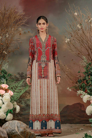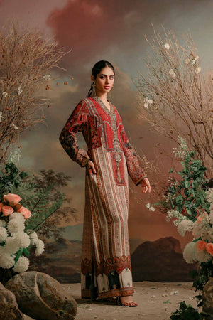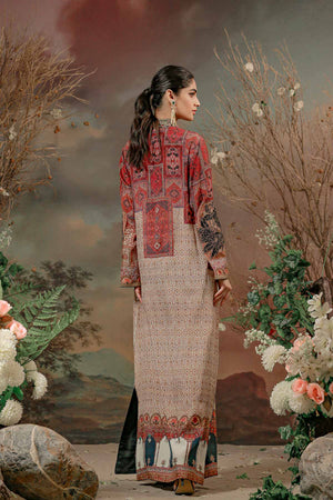 Beautifully printed kurta on silk fabric with a chic silhouette. delicate printed kashmiri inspired design. beautiful delicate taankas embroidered on the gallah in the style of kashmiri textiles. thoughtfully crafted ornamental embroideries with delicate zardozi work.Collection: Guzel Eid Collection 2021