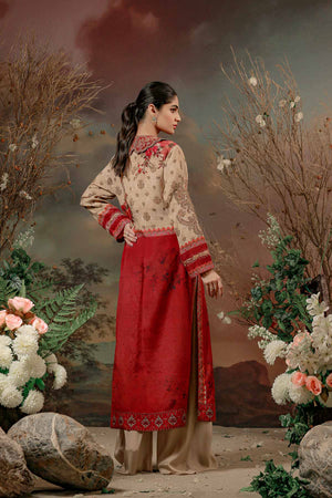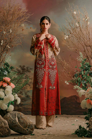 Original tapered shamaeel silhouette. indigenous shamaeel print in shade of beautiful vintage ivory and maroons textural print on the silk fabric with a symmetrical floral layout. accompanied by beautiful cutwork collar enhanced with antique tila thread work. Delicate handcrafted ornament embellished with zardozi, resham and tila thread work.Collection: Guzel Eid Collection 2021