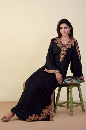 This sophisticated black kaftan radiates elegance with its intricate golden embroidery. The long, flowing silhouette is adorned with detailed embroidered neckline, sleeves, and hem, adding a regal touch to the outfit. The warm golden tones contrast beautifully against the deep black fabric, creating a timeless and luxurious appeal.