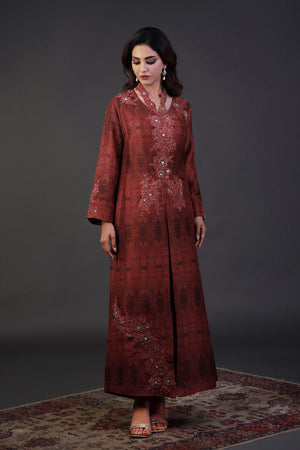 This stunning deep red ensemble exudes timeless elegance with its rich fabric and intricate embellishments. The long, straight-cut silhouette is adorned with delicate embroidery and shimmering accents around the neckline and bodice, adding a touch of regal charm. The subtle patterns woven throughout the fabric enhance its luxurious appeal, making it a perfect choice for formal occasions or festive gatherings.