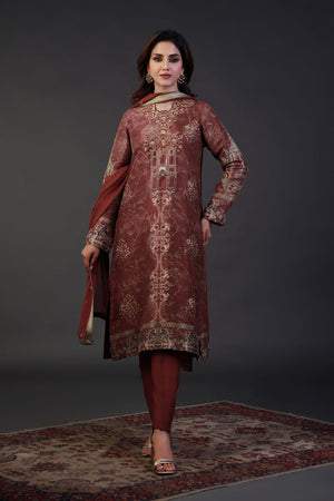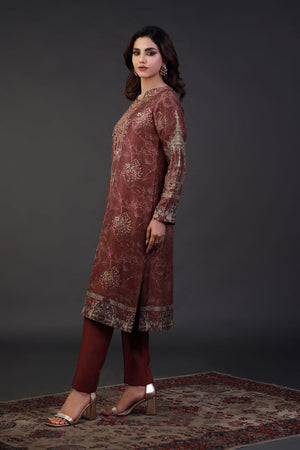 This ensemble is a striking deep red outfit featuring intricate gold and silver embroidery, evoking a regal and timeless elegance. The long tunic is adorned with symmetrical patterns, delicate floral motifs, and ornamental detailing, reminiscent of traditional architectural designs. The borders are finely embellished, enhancing the richness of the attire. Paired with tailored red trousers and a matching dupatta with gold-trimmed edges, this outfit is perfect for formal occasions, weddings, or festive gatherings. The structured silhouette, luxurious fabric, and exquisite craftsmanship make it a statement piece, embodying sophistication and grandeur.