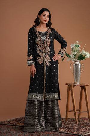 This striking black ensemble radiates regal elegance with its intricate gold and multicolored heavy embroidery adorning beautifully on the neckline, sleeves, and hem. The long, open-front jacket is embellished with delicate motifs, while the rich Jamawar inner dress adds depth and luxury. With the sheer, embroidered dupatta, this outfit is a perfect blend of traditional craftsmanship and contemporary sophistication, ideal for festive and formal occasions.