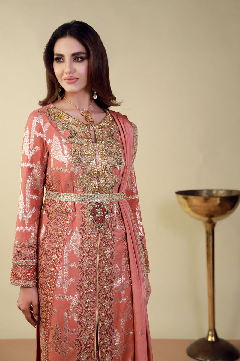 This coral traditional long front-open silhouette, crafted from chiffon and Jamawar, features intricate embellishments paired with matching pants and a dupatta. The silhouette is beautifully adorned with a heavily embroidered neckline and straight sleeves, adding a touch of sophistication. A delicate embroidered border, accented with a hint of gold lining on the sleeves, border continues along the hemline for an elegant finish. The sheer dupatta, with its delicate borders, complements the dress’s ethereal look. This refined ensemble is perfect for weddings or festive occasions.