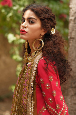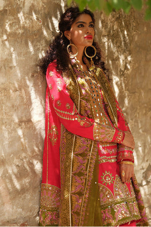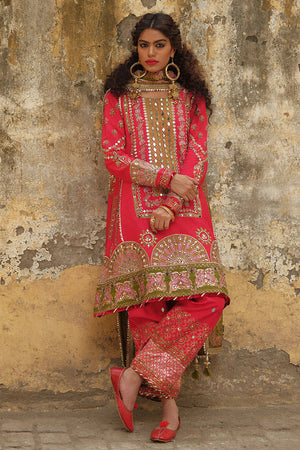 Eeshal is our Jaipur red kameez pajama signature MNR ensemble. The shirt is made out of luxurious Italian silk and features a block print of birds across the sleeves and hem of the shirt done in pink, green and gold. It is further embellished with glittering sheesha work and hand embroidery across the neckline. The ensemble is completed with a traditional pajama of matching hue featuring complementing block printed motifs and embroidery around the cuffs. It is paired with a light organza dupatta in a contrasting henna green shade, also adorned with blockprints of bird motifs, spray of sequins and trims across all sides.The shipping charges for all articles barring Bridals are as follows:
